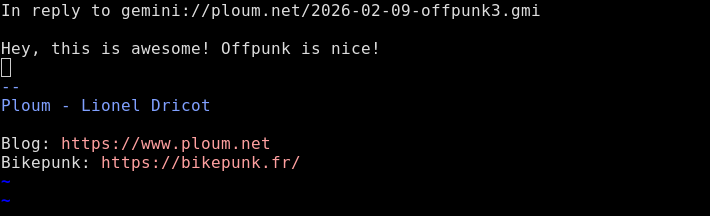 I even started using Offpunk as an address book for my blogger friends. Instead of laboriously autocompleting their email addresses, I go to their blog/gemini capsule/gopher hole and write "reply".