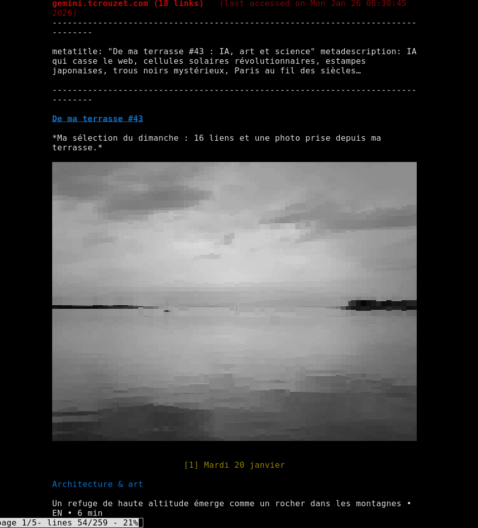 Remember that images are displayed as "blocks" when reading a page but if you access the image URL directly (by following the yellow link beneath), the image will be displayed perfectly if you are using a sixels-compatible terminal.